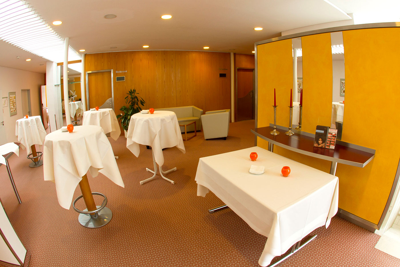 Ein flexibles Konzept bieten die Räume Bodensee, Schwaben und Altdorf. Je nach Bedarf und Veranstaltungsgröße lassen sich die Räume kombinieren. Mit festlich eingedeckten runden Tischen bieten die Konferenzräume einen stimmungsvollen Rahmen für Ihre Familienfeier.
